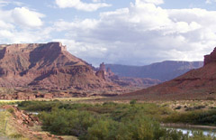 Descendant du Yellowstone, nous traversons le sud du Wyoming, pays du cheval sauvage, le mustang. Etapes dans des villes moyennes sans autre intérêt que de pouvoir faire le plein de victuailles. Soudain, au nord de l'Utah et au détour d'une petite route à peine indiquée sur la carte (la 128), c'est le choc : le fleuve Colorado nous offre son premier grand spectacle. Au soleil qui décline, des rochers de toutes formes et de toutes couleurs défilent de chaque côté. Encore novices, nous multiplions les arrêts-photos, sans savoir que chaque jour nous en verrons à profusion. Mais nos premières impressions sont d'émerveillement. Chacun de nous trois pousse des Oh ! et de Ah ! à chaque virage et voit de sa fenêtre un spectacle différentLa route 128 et ses faux châteaux moyenageux